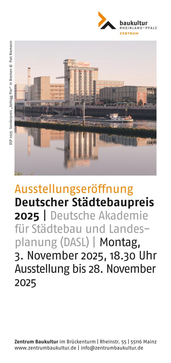 Das Zentrum Baukultur in Mainz zeigt die Wanderausstellung zum Deutschen Städtebaupreis 2025 vom 4. bis 28. November 2025 und lädt herzlich ein zur Ausstellungseröffnung unter Beteiligung von DASL am Montag, 3. November 2025, 18.30 Uhr.